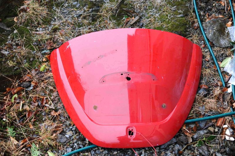 Svart motorlokk 67 mod. solid men har vert slipt ned med vinkelsliper eller liknande. Fleire hull etter skilter gjennom tida. 150,-