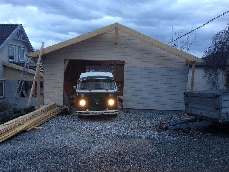 Garasjen er ikke helt ferdig enda, men det nærmer seg. Jeg får invitere til en kopp kaffe når den er klar!