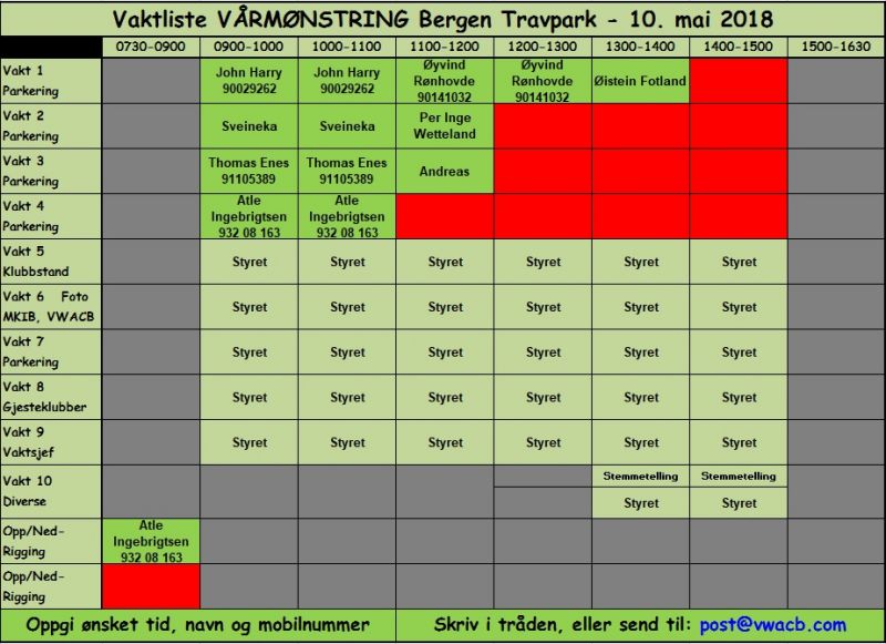 Vi henstiller derfor alle som deltar på arrangementet om også å støtte opp om arrangementet ved å ta en times vakt, eller to... Hjelp oss å fylle opp de røde feltene!