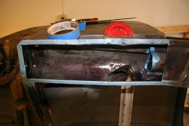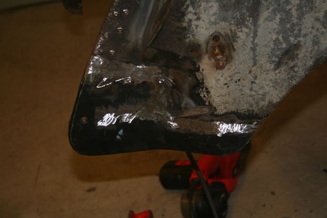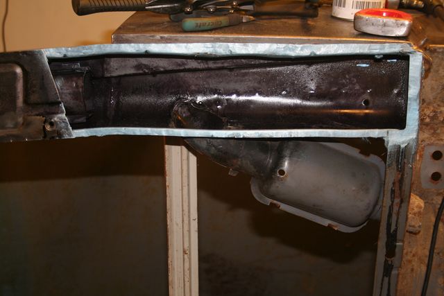 Til slutt lakkerte jeg resten av kanalen med syregrunning. Gikk over undersiden bak med roterende stålbørste og lakkerte her og.