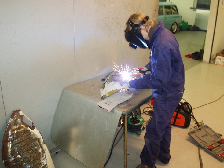 Med bil er det jo gjerne litt andre ting enn bare sveising med et arbeidsstykke på en benk foran deg, sveisingen er gjerne bare "finalen" etter en god del forarbeid med rengjøring, tilpassing, plateklipping og -knekking - og mer tilpassing. Dette er vel kanskje tema på "karosseri-kurset"? Uansett kommer en ikke så langt om en ikke får sveist fast delene, så her er det bare å brett opp ermene og sette i gang.