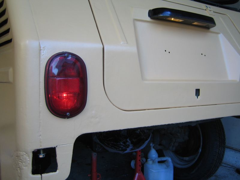 I går og idag har jeg satt på panser, frontrute, skjermkjeder og skjermer. Lykter er montert, koblet og testet. Bak har jeg satt på helrøde baklys, da det er det som er originalt. Alt virker, unntatt hornet.