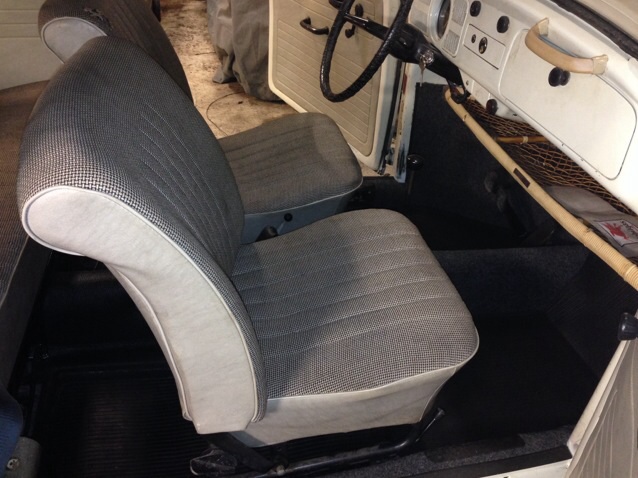 Det går på frem med interiøret i Ormen. Det blir litt mix & match med teppesett fra Landrover, de originale setene og gummimatter donert av Bjarte og Hildur. Vi mangler fortsatt matter eller tepper til gulvet foran setene, så ta kontakt om du har noe vi kan bruke.