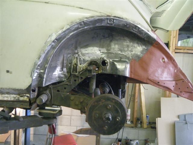 ny kant på plass, grov tilpassing so da blei mykje sveising. utkappet er frå 67, brukte alu folie over skommet i innerskjermen , hindrar lokale brannar, og beskyttar ledningane. under punkting og tilpassing brukte eg to stk vinkelsliparhåndtak og skrudde i skjerm muttrane, gjer enkel og stødig manøvrering av plata