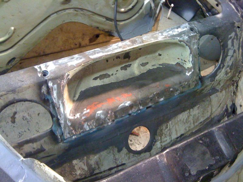Litt jobb ikveld. Baljen fremme er sveist på igjen. Har fjernet limen på motorromsveggen bak. Noen som har gode råd til fjerning av seig kontaktlim fra teppene fremme under dasjen?
