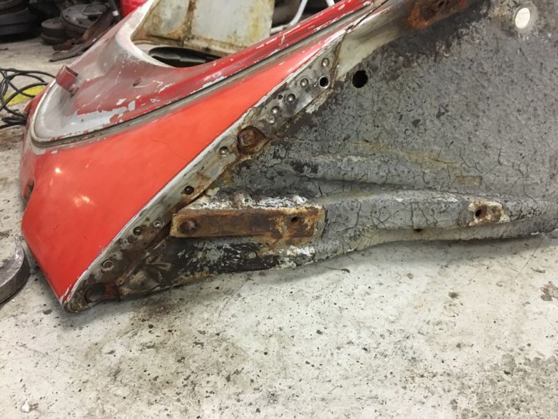 Lenge siden oppdatering her nå. I dag begynte jeg å plukke litt i et utkapp fra en 66 som min gode venn og mekkeplassnabo tilfeldigvis hadde liggande! Kan se ut som det kan brukast både spiss og støtfangerfeste, men først må det borres litt mer.