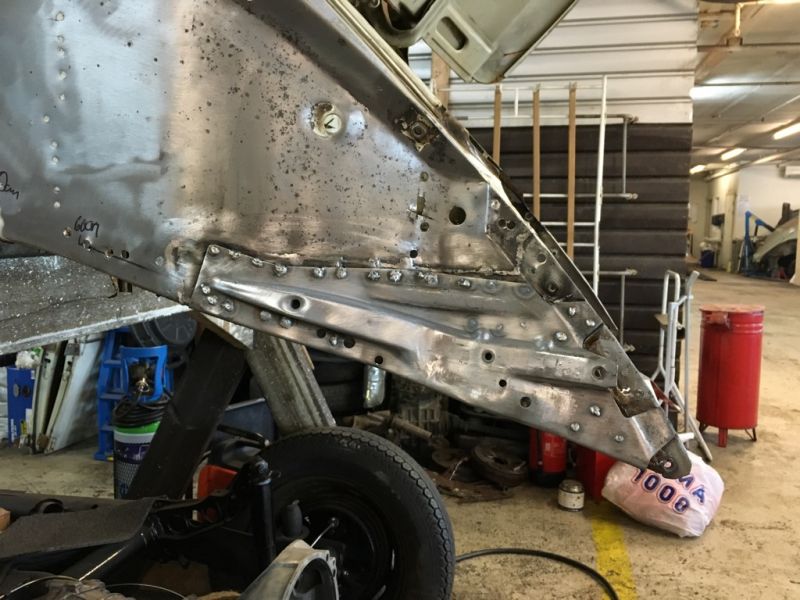 I dag ble det venstre støtfangerfestet spleiset med universal-støtfangerfestet som var boltet på bilen. Etterpå ble det ble sveiset fast på bilen.
