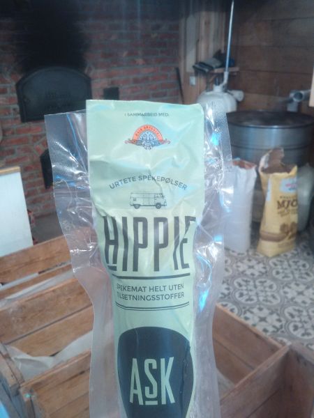 Til påsmurt i bakeriet kjøper kåno pølser frå Ask gård, på Jevnaker. Dei har mange gode pølser, og på ei av dei har dei limt inn ein tegning.