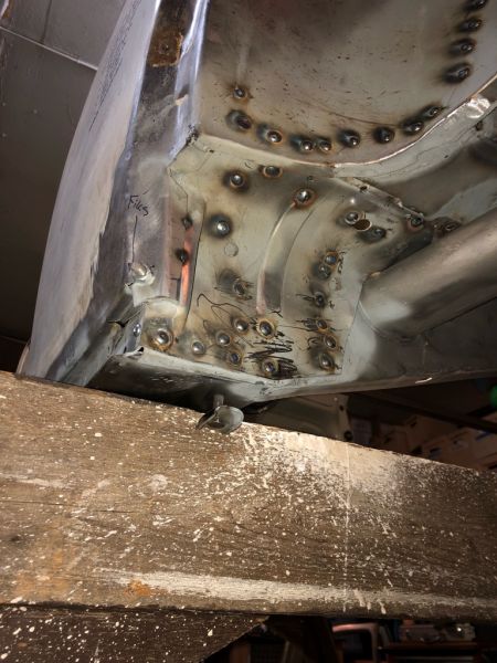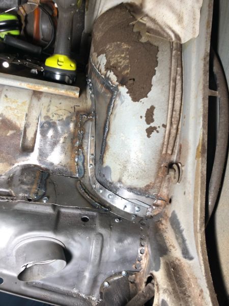Bakre hjørne i hjulbuen mot kanal venstre side er lappet og karosserifestet ble først ut.