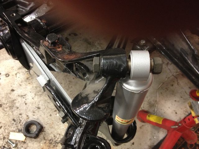 Har en morsom bolt som ikke er i senter av hylsen som går gjennom foringen på A-armenr, På denne måten kan en løfte og senke armen her inne ved "pendelpunktet" og få en ekstra justeringsmulighet bak. Race!