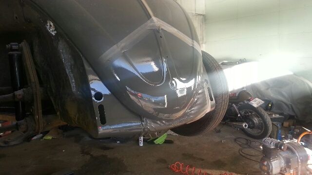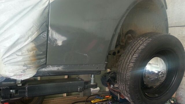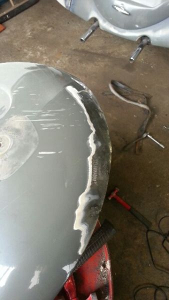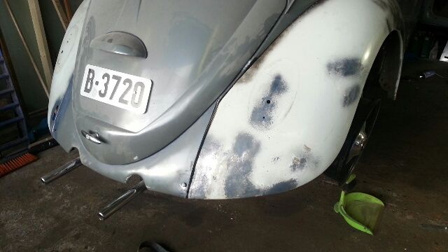 Panseret var dårlig nederst. Sprekker og bulker som var sparklet over. Nå er det fortsatt litt småbulker, men solid. Kristian hadde liggende pakning mellom karrosseri og bunn, så nå skal det snart skrus sammen, lakkes og godkjennes.