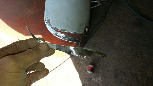 Da har jeg begynt på skjermene. Ene bakskjermen var så dårlig rundt støtfanger-festet at det måtte bare sveises igjen. Litt bulkretting ble det også. Nå er det bare å få laget nytt hull. Andre skjermen var ok, men har funnet ut at ene skjermen går mye lenger ned under stigtrinnet enn andre....Har dette med årsmodell å gjøre? Fabrikant? Ca. 2.5 cm forskjell. Blir nok å korte inn den som er for lang. Framskjermene er ok. Dette er forresten gamle skjermene fra Magda som blir gjenbrukt.