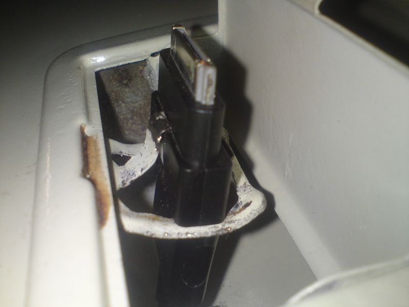 Da Kai elling hadde montert den, var det med en "AUX iphone kontakt" fra clasohlson, men jeg har seinere byttet den ut med en original ladekabel fra apple.. ja, den er litt tynn, men det gikk. tredde et lite strips innimellom den saken i midten på den bøylen nedi aksebegeret. og i i tilleg brukte jeg 2 komponent epoxy(rød araldite) for å få den til å henge bedre. eller det må til, da den bare ville ski av med bare strips..
