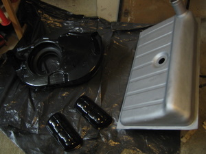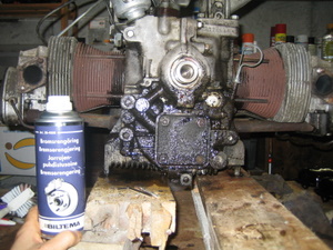 Har gjort litt med motoren. Den var ganske tilgriset av olje, forsøkte meg litt frem med forskjellige metoder. Bremserens fra Biltema fungerte brukbart, men den beste løsninga var ren bensin. Da løsnet olja veldig lett, og med ei spruteflaske kom jeg til på de trange stedene på blokka. Kjøledekslene ble plassert i en dunk med bensin og rengjort med oppvaskkost. Har også begynt å lakkere tank og diverse deksler.